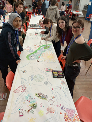 Après le souper du samedi, les étudiantes et étudiants, aidés par l’enseignant, on relevé le défi Arts + Sciences en créant une fresque intitulée « le fleuve de la connaissance ».