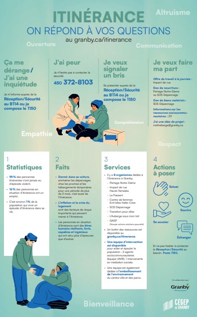 Le Cégep a également produit une fiche d’information intitulée Itinérance : on répond à vos questions. Ce document concis, accessible sur le portail Omnivox, est une adaptation personnalisée de la fiche élaborée par la Ville de Granby.